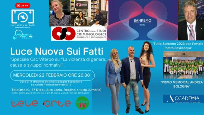 approfondimento tematico settimanale ideata e condotta dal giornalista viterbese Gaetano Alaimo. Il 22 febbraio alle 20.30 su TeleOrte (C. 77 Dtt visibile su tutta l’Umbria, Alto Lazio e provincia di Rieti) e, ogni giorno, su La Voce Tv (C.188 Dtt Lazio) con programmazione alle 9.30, 20.40 e 23.15, ed in streaming sulla pagina di Luce Nuova sui fatti di Facebook e sul circuito LSFN sarà in onda il format settimanale più seguito dell’Alto Lazio e tra i più seguiti del Centro Italia.