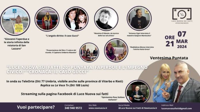 Scatta la ventunesima puntata ufficiale della quarta edizione di “Luce Nuova sui fatti”. Giovedì 7 marzo alle 21, su TeleOrte (Dtt 77 Umbria, visibile anche nelle province di Viterbo e Rieti) e su La Voce Tv (Dtt 188 Lazio) e sulla pagina https://www.facebook.com/lucenuovasuifatti?locale=it_IT e sul circuito LNSF