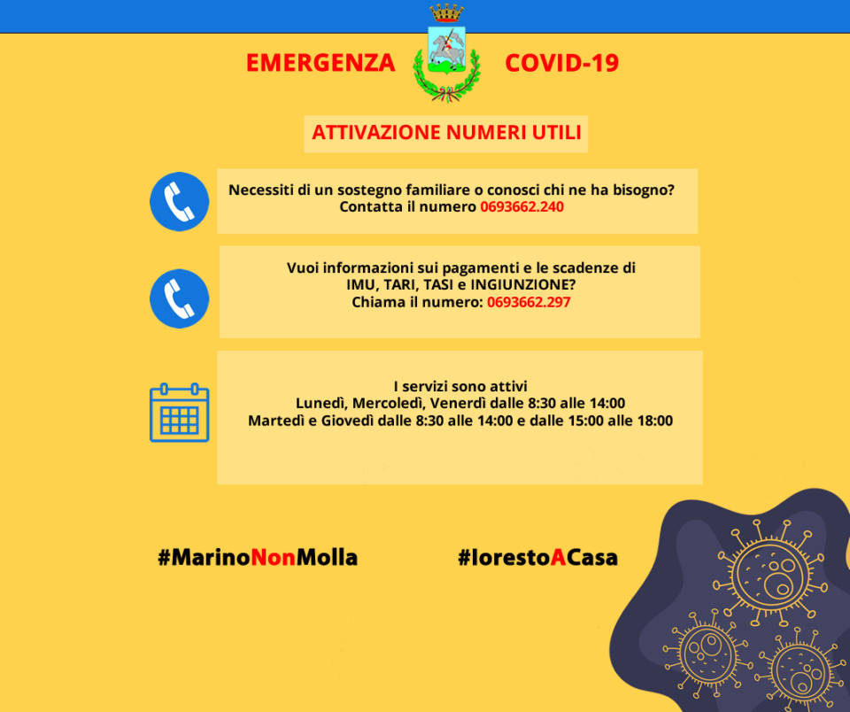L’Amministrazione Comunale, per venire incontro alle esigenze della popolazione in questo momento di Emergenza nazionale dovuta al COVID-19, ha attivato i seguenti numeri: