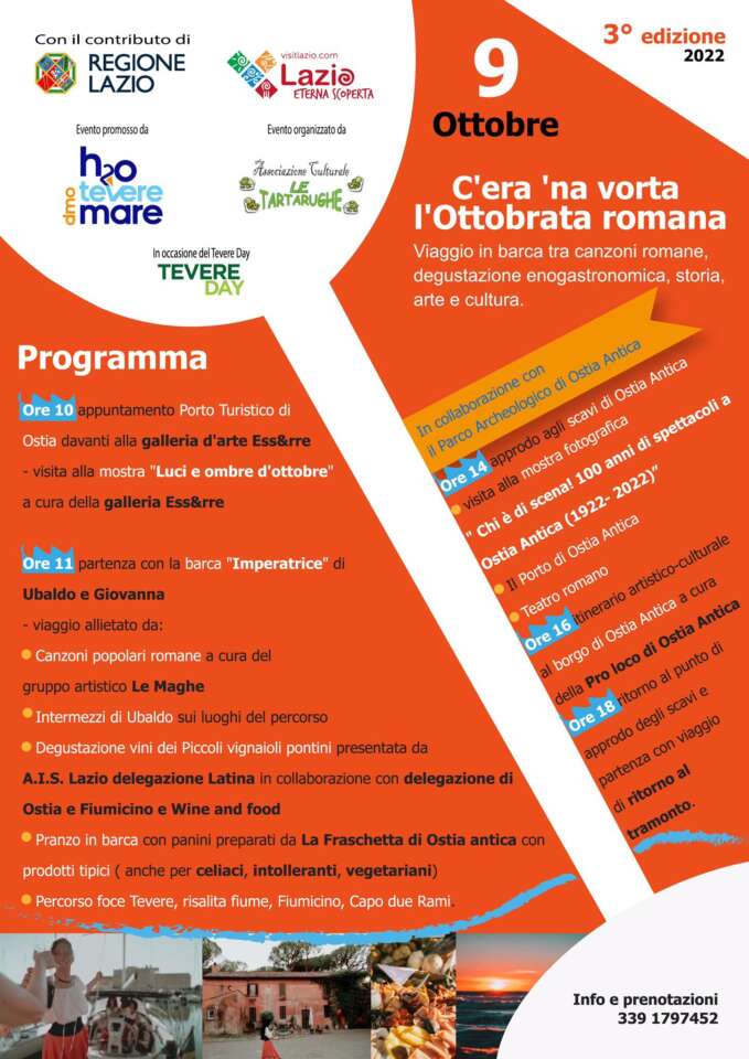 Il rilancio del turismo della Capitale e la valorizzazione del suo patrimonio artistico, culturale e ambientale: sono gli ingredienti di una serie di iniziative avviate dalla neonata Associazione DMO “H2O Tevere Mare” che domenica 9 ottobre in occasione del Tevere Day entrerà nel vivo con la terza edizione di “C’era ‘na vorta l’ottobrata romana”: un evento suggestivo realizzato grazie alla preziosa collaborazione dell’
