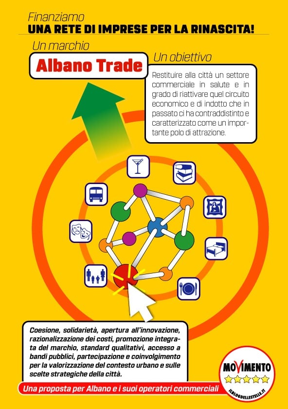 Restituire alla città un settore commerciale in salute e in grado di riattivare quel circuito economico e di indotto che in passato ci ha contraddistinto è caratterizzato come un importante polo di attrazione. Il progetto di rete, qualora i nostri imprenditori lo recepiranno con entusiasmo , potrà infatti generare ricadute positive per il settore e per l’intera città. Coesione, solidarietà, apertura all’innovazione, centralizzazione e razionalizzazione dei costi, promozione integrata attraverso un marchio e definizione di standard qualitativi, accesso a bandi pubblici, formazione specifica, partecipazione e coinvolgimento per la valorizzazione del contesto urbano e sulle scelte strategiche della città’ sono le opportunità concrete alle quali una grande rete di imprese potrebbe accedere e trarre beneficio. Sarebbe quindi auspicabile attivare un dibattito sul tema, propedeutico ad una azione unitaria, rapida e condivisa affinché per una volta tutta la città si muova insieme, determinata è convinta di poter ridisegnare un progetto vincente e al passo con i tempi. Lanciamo pertanto un appello a tutti gli imprenditori del commercio, ai settori produttivi, alle associazioni, ai partiti politici e alla cittadinanza tutta ad accogliere questa proposta per il rilancio della città di Albano Laziale. Noi ci siamo, con il nostro contributo economico e con dei contenuti che aprono la strada ad una azione aggressiva e determinata…il tavolo è aperto. Chi ci sta?” Dichiara Luca Nardi, Candidato Sindaco M5S Albano Laziale