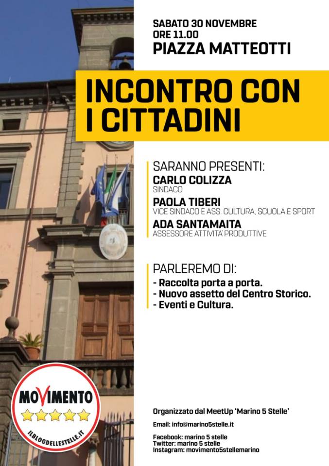 “Sabato 30 Novembre, nella Marino medievale, in Piazza Matteotti, inizia un ciclo di incontri dell’Amministrazione pentastellata di Marino con i cittadini, in questo primo appuntamento il Sindaco Carlo Colizza, il Vicesindaco ed Assessore alla Cultura Scuola e Sport Paola Tiberi e l’Assessore alle Attività produttive Ada Santamaita parleranno con i cittadini di raccolta differenziata dei rifiuti, di eventi, cultura, promozione dei prodotti tipici locali e di un nuovo centro storico che ne torni a valorizzare la bellezza e l’unicità. Marino è stato l’ultimo comune dei vicini “castelli” ad adottare la raccolta porta a porta con risultati immediatamente lusinghieri: raccolta differenziata triplicata in poco più di un anno, dal 21% ad oltre il 65%, con una sensibile riduzione del totale dei rifiuti inviati in discarica ed una diminuzione media della TARI dell’11%. Gli eventi, di sempre più alto profilo culturale e di valorizzazione delle peculiarità enogastronomiche del nostro territorio, spesso abbinati a pedonalizzazioni sperimentali, hanno ravvivato il centro storico e riscontrato il gradimento e la folta partecipazione del pubblico. Una pedonalizzazione stabile sarà il prossimo passo per la valorizzazione della Marino medievale, unita al recupero delle cantine storiche, del sistema di grotte, dell’Ostello e del Mitreo. Il crescente livello qualitativo della Sagra dell’uva ed il nuovo appuntamento in calendario “Calici di stelle” stanno attraendo nuovo turismo. È stato registrato dall’Unione Europea il marchio collettivo di Marino per quattro prodotti tipici: ciambella al vino, ciambella al mosto, pane e vino. Dopo trent’anni è stato riaperto il Teatro Vittoria e siamo alla terza stagione. Il premio letterario Sandro Sciotti ha ormai risonanza nazionale con scrittori partecipanti da tutta Italia. I cittadini potranno ascoltare quanto è stato fatto e quanto si sta facendo e porre domande direttamente agli esponenti dell’Amministrazione. Gli incontri che seguiranno si svolgeranno in tutte le aree del territorio ed abbracceranno i vari temi di comune interesse”. Lo dichiara il Meetup Marino 5 Stelle