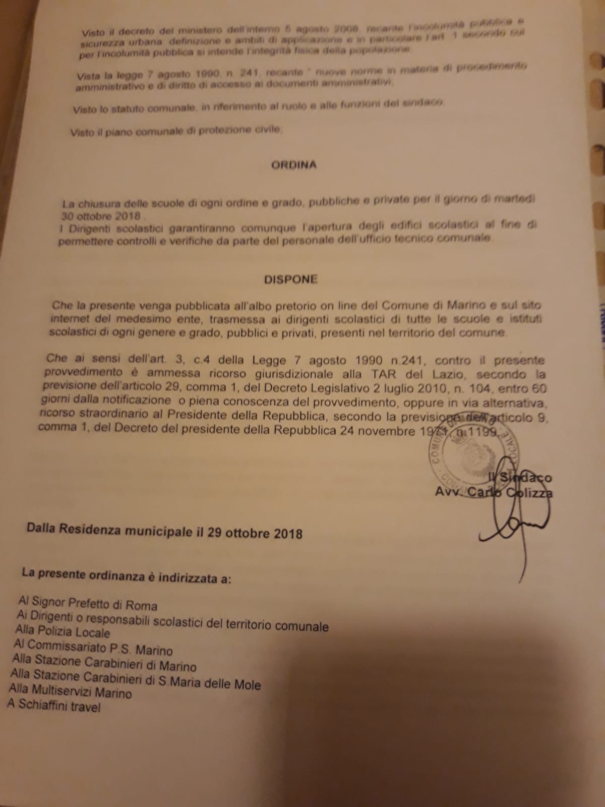 Ordinanza di chiusura delle scuole di Ciampino lunedi 29 ottobre 2018