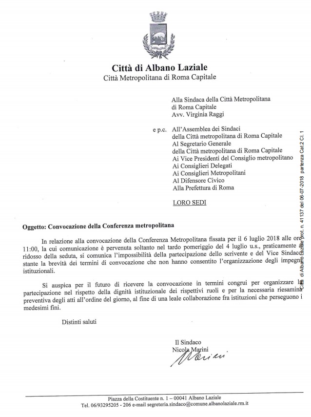 letteraraggi“Leggo sui media che il Sindaco di Roma e della Città Metropolitana, Virginia Raggi, si lamenta  della mancanza del numero legale in occasione Conferenza dei Sindaci per l’approvazione del Bilancio di Previsione 2018 – 2020. È veramente sorprendente e del tutto singolare! La convocazione per la seduta è giunta al protocollo del Comune di Albano Laziale soltanto nel tardo pomeriggio di ieri, quindi con un preavviso di nemmeno 24 ore. Immagino che anche agli altri Comuni sia stata comunicata con la stessa tempistica. Di fatto non è stato consentito agli amministratori di poter programmare gli impegni istituzionali in modo da garantire la presenza per questa importante seduta della Conferenza dei Sindaci della Città Metropolitana di Roma Capitale. Inoltre non è stata nemmeno garantita l’indispensabile e preventiva disamina degli atti all’Ordine del Giorno. Auspichiamo, per il futuro, di ricevere in tempi congrui le comunicazioni. Deve essere garantito il rispetto della dignità istituzionale di tutti, ognuno nel ruolo che ricopre. In tal senso ho inviato una specifica missiva al Sindaco della Città Metropolitana Virginia Raggi, all’Assemblea dei Sindaci, ai Consiglieri Metropolitani, al Difensore Civico e alla Prefettura di Roma”. Così in una nota il Sindaco di Albano Laziale, Nicola Marini.
