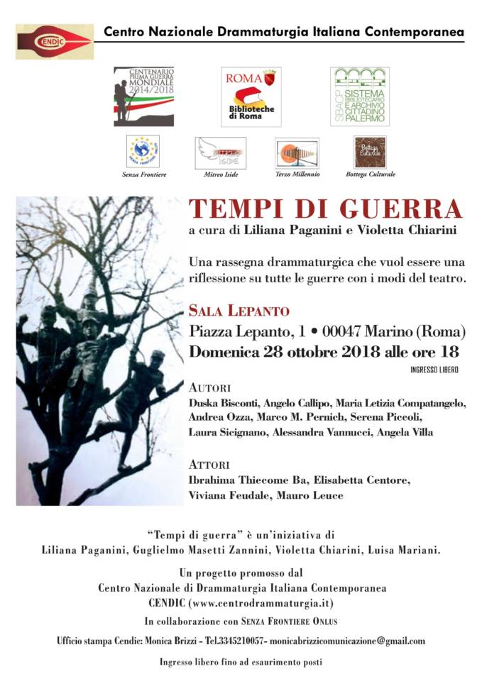 Farà tappa a Marino, domenica 28 ottobre alle 18 presso la Sala Lepanto (Piazza Lepanto, 1 – Marino), la rassegna drammaturgica “Tempi di Guerra”. L’ingresso sarà libero. L’iniziativa di Liliana Paganini, Guglielmo Masetti Zannini, Violetta Chiarini e Luisa Mariani è una riflessione su tutte le guerre con i modi del teatro. La manifestazione è stata promossa dal CENDIC – Centro Nazionale di Drammaturgia Italiana Contemporanea con il patrocinio della Presidenza del Consiglio dei Ministri, delle Biblioteche di Roma e delle Biblioteche di Palermo in collaborazione con le associazioni Senza Frontiere Onlus, Terzo Millennio – Compagnia del Violangelo, Mitreo Iside e Bottega Teatrale.