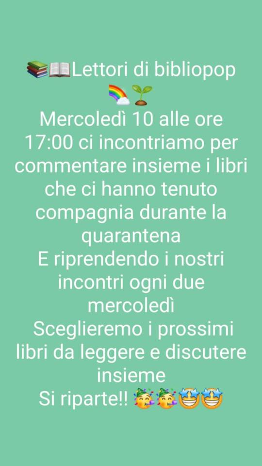 Il presidente di Acab/BiblioPop, Sergio Santinelli, ricorda che “anche grazie alla recente esperienza che ha visto la presenza di dirigenti e attivisti Acab che hanno coadiuvato le azioni della Protezione Civile locale, sia nelle altre forme proprie della attività dell’associazione nel diffondere i libri ed essere stati presenti, consente ora, durante la ripresa lenta delle attività, qualche novità. Perché è giusto mantenere ancora un comportamento di cautela, e, quindi, innovare la nostra capacità di proposta culturale, vista la volontà di mettere in campo di nuovo BiblioPop e il suo poliedrico mondo. Devo intanto comunicare piacevolmente – continua l’apprezzato e benvoluto presidente – che dal 18 maggio, giorno della parziale riapertura selettiva, alcuni nuovi lettori hanno richiesto l’iscrizione alla Associazione, così come, c’è stata la richiesta di prestito dei libri. Altri giovanissimi, in particolare giovani ragazze, si sono proposte per svolgere forme di attività rispettando i canoni del comportamento sicuro. Per questo, mercoledì 10 e venerdì 12, organizzato soprattutto col metodo del passaparola, ci saranno due appuntamenti di Baby Dance all’aperto, nel Parco Maura Carrozza adiacente BiblioPop. Intanto, sempre mercoledì 10, in un altro angolo, coordinati da Laura Silvestri, i “Lettori di BiblioPop” si incontrano per commentare insieme libri che ci hanno tenuto compagnia durante quarantena. E riprende così l’attività a cadenza bisettimanale per selezionare libri da leggere e commentare. Inoltre, questa ripresa – prosegue nel descrivere Sergio Santinelli – ha già il sapore della buona notizia di qualità. Infatti, a fronte di una decisione di cui non sappiamo le motivazioni (cioè lo smantellamento, parziale o totale, della biblioteca che aveva organizzato Don Bruno Meneghini), l’assessore Adolfo Tammaro, nostro frequentatore, ci ha consegnato molti volumi del Fondo librario che, appunto, era allocato presso la parrocchia San Giuseppe di Frattocchie. Inoltre, il Comitato Esecutivo dell’associazione, visto il successo storico della presentazione dei libri, e l’accoglienza positiva delle giornate all’aperto nel Parco proposte in occasione della Festa della Repubblica, ha deciso di strutturare come “Arena BiblioPop” gli incontri che stiamo programmando utilizzando distanziamento e posti a sedere limitati. Il primo di questi appuntamenti sarà per sabato 13 giugno””. Lo rende noto Bibliopop.