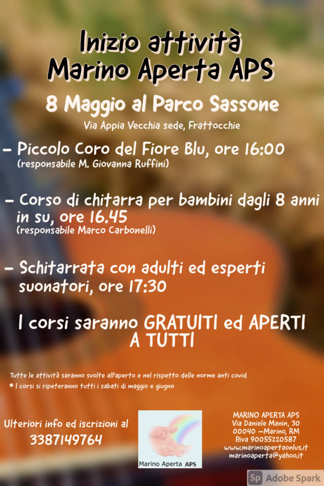 Da sabato 8 maggio si riavviano presso il Parco Sassone, Via Appia Vecchia Sede a Frattocchie, due delle attività più seguite da oltre 15 anni dell’associazione Marino Aperta APS: il coro dei bambini e i corsi di chitarra per piccoli e grandi.