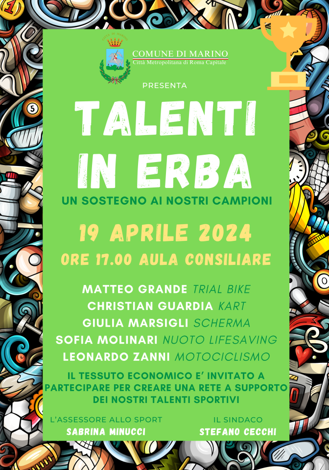 Venerdì 19 aprile p.v. alle ore 17,00 presso l’Aula Consiliare si terrà l’evento “Talenti in Erba”, un sostegno ai nostri campioni.