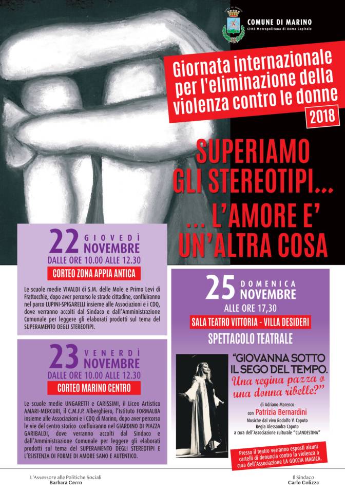 Un altro corteo si svolgerà venerdì 23 novembre 2018 a Marino centro con partenza alle ore 10,00: le scuole medie Ungaretti e Carissimi, il Liceo artistico AMARI-MERCURI, il Centro di Formazione Professionale Alberghiero, l’Istituto FORMALBA insieme alle Associazioni e ai Comitati di Quartiere dopo aver percorso le vie del centro storico confluiranno nel Giardino di piazza Garibaldi dove li accoglieranno il Sindaco e l’Amministrazione Comunale per leggere gli elaborati prodotti sul tema del “Superamento degli stereotipi e sull’esistenza di un amore sano e autentico”.