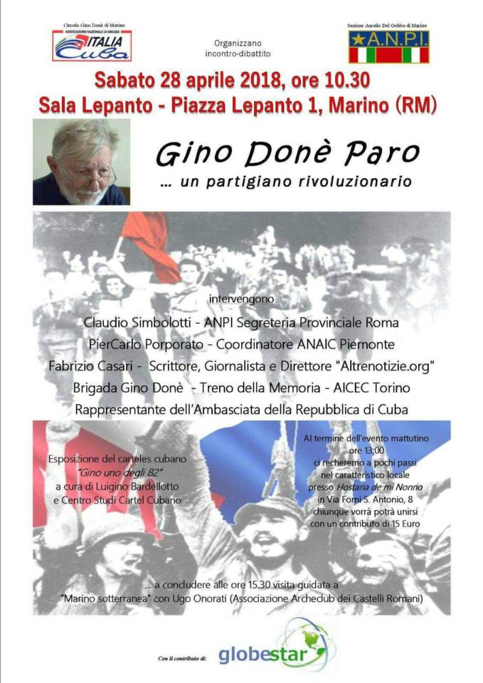 Un sabato, quello del 28 aprile a Marino scelto dal Circolo di Italia Cuba “Gino Donè” e dalla Sezione ANPI “Aurelio Del Gobbo” per mettere insieme i temi alti, e i valori, della Liberazione dell’Italia dal nazifascismo grazie alla Resistenza; e la costruzione della società socialista cubana con la Rivoluzione ancora viva. Una personalità, una vita spesa a difesa e a realizzare queste passioni e questi valori universali di uguaglianza e libertà, unisce l’Italia e Cuba: è Gino Donè Paro. Un uomo che da giovanissimo ha partecipato, coi partigiani, alla Resistenza italiana; e, in seguito allo sbarco con gli 82, tra cui Che Guevara e Fidel Castro, alla Rivoluzione cubana.