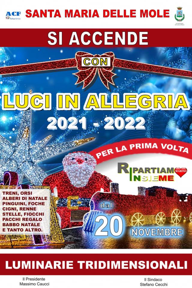 L’evento, che interesserà tutta l’area principale di Santa Maria delle Mole, inizierà sabato 20 novembre e terminerà domenica 9 gennaio 2022. Un Natale davvero magico, con treni luminosi, orsi polari giganti, un albero alto 14 metri, pinguini, foche, cigni, renne, passaggi luminosi, stelle, fiocchi, mongolfiere luminose, personaggi dei cartoni animati, pacchi regalo luminosi, Babbo Natale gigante, che cattureranno l’attenzione e i cuori di grandi e piccini e richiameranno tantissima gente dai comuni limitrofi.