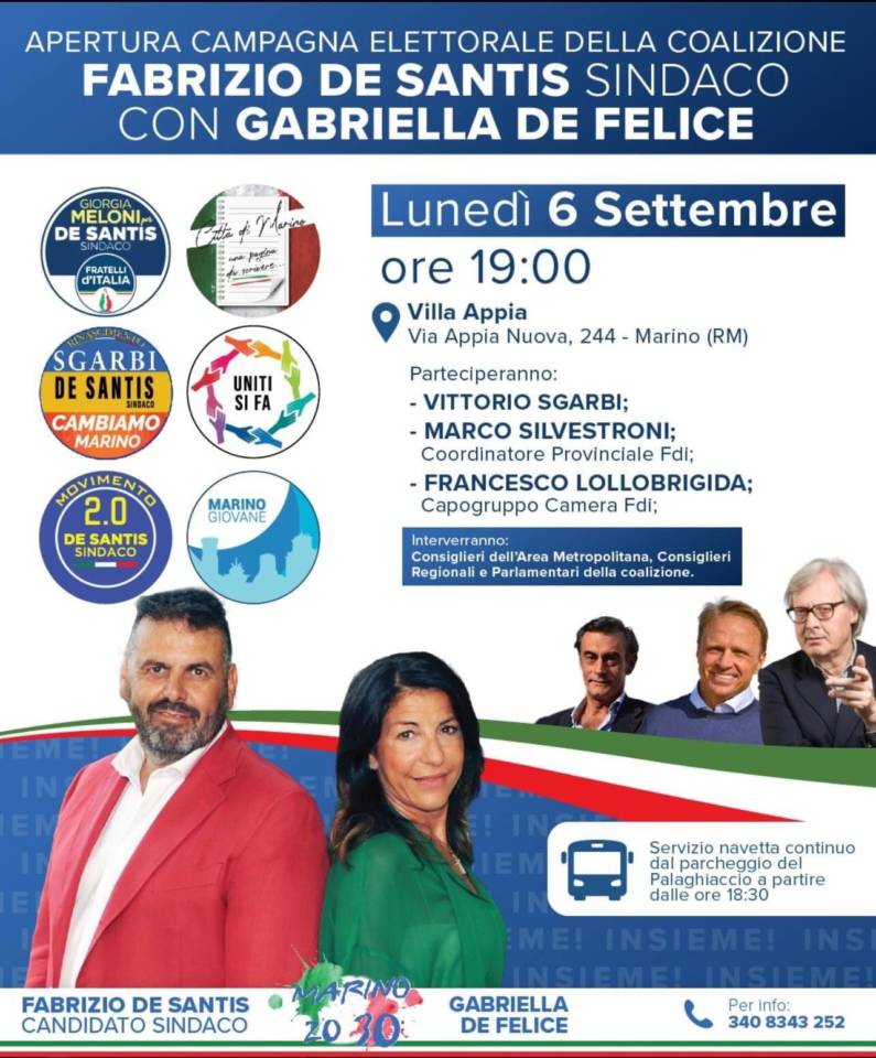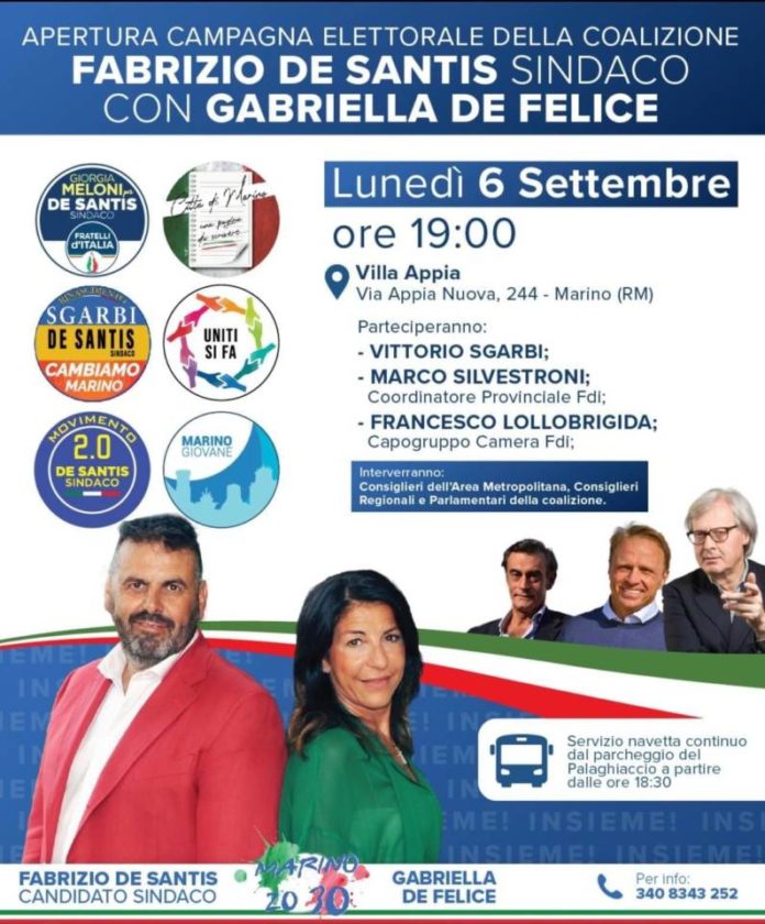 È tutto pronto a Marino per l’apertura della campagna elettorale della coalizione che sostiene il candidato sindaco, Fabrizio De Santis, in ticket con Gabriella De Felice candidato prosindaco, in previsione delle elezioni amministrative dei prossimi 3 e 4 ottobre. Lunedì 6 settembre, infatti, a partire dalle ore 19, nella splendida location di Villa Appia, in via Appia Nuova 244 a Marino, è prevista la presentazione ufficiale delle sei liste che compongono la coalizione: Fratelli d’Italia, Cambiamo-Rinascimento, Città di Marino – Una Pagina da scrivere, Movimento 2.0 De Santis sindaco, Uniti si fa, e Marino Giovane. All’evento, a cui sono invitati stampa e cittadini, saranno presenti Vittorio Sgarbi, leader di Rinascimento, l’esponente nazionale di FdI e Capogruppo alla Camera di Fratelli d’Italia, Francesco Lollobrigida, il coordinatore provinciale Fdi e deputato della Repubblica, Marco Silvestroni, e il consigliere regionale del Lazio e responsabile nazionale Organizzazione di Cambiamo con Toti, Adriano Palozzi. Saranno presenti, inoltre, consiglieri della città Metropolitana di Roma Capitale, consiglieri regionali del Lazio e Parlamentari, espressione della coalizione. Si comunica infine che l’iniziativa si svolgerà nel rispetto delle norme antiCovid e che, per tutti coloro che vorranno partecipare, è a disposizione un servizio continuo di bus navetta nel parcheggio del Palaghiaccio di Marino, in località Cava dei Selci, a partire dalle ore 18.30.