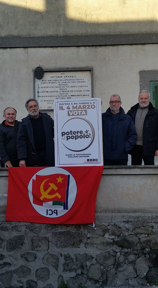 Come si potrà notare dalla foto allegata, la delegazione del PCI formata dal Segretario di Marino, Stefano Enderle, da Maurizio Aversa, da Sergio Santinelli e da Maurizio Iagher, hanno reso omaggio alla nascita del PCI di Gramsci del 21 gennaio 1921. Lo hanno fatto ( anche se con un errore di “posa” perché la bandiera è girata) sotto la stele marmorea che ricorda la presenza clandestina di Antonio Gramsci nel capanno, poi casa del partigiano compagno Aurelio Del Gobbo, qui nei Castelli romani a Fontana Sala, nei canneti proprio vicino a quella che diventò la scuola di Partito del PCI di Togliatti. Nel fare questo gesto, immortalato, i compagni hanno voluto confermare proprio il cammino di ricostituzione e ricostruzione del PCI che continua speditamente come scelto a Bologna un anno e mezzo fa. Cogliendo, tra l’altro, l’opportunità di verificare immediatamente – vista la fase politica e le scomposizioni e ricomposizioni sociali e politiche in atto – sia la possibilità di stringere forti alleanze sociali con le lotte e i movimenti presenti e organizzati, sia elettoralmente costruendo unitariamente con tanta parte di comunisti e di sinistra sociale la lista di Potere al Popolo. Per questo nella foto allegata, c’è la compresenza della bandiera comunista e del simbolo elettorale che sarà sulle schede elettorali di politiche e regionali del 4 marzo prossimo. Per noi la scelta è chiara, la direzione una, gli obiettivi quelli condivisi. Dopo aver fatto la foto ( forse con scaramantico intervento delle decisioni composite) oggi possiamo anche comunicare ufficialmente, che il PCI marinese è ancor più fortemente motivato per i riconoscimenti ottenuti, non solo dal partito, ma dalle assemblee dei Castelli romani e della Provincia di Roma che hanno approvato la candidatura alla Camera dei Deputati, Uninominale collegio di Marino, il compagno Sergio Santinelli; e la candidatura alla Regione Lazio il compagno Maurizio Aversa. Intanto invitiamo, tutti i compagni e i cittadini che vogliono sostenere le Liste di Potere al Popolo anche con la firma di supporto, di recarsi presso il BarMameli dalle 16.00 in poi di giovedi 24. Naturalmente provvisti di documento e codice fiscale (o tessera sanitaria).
