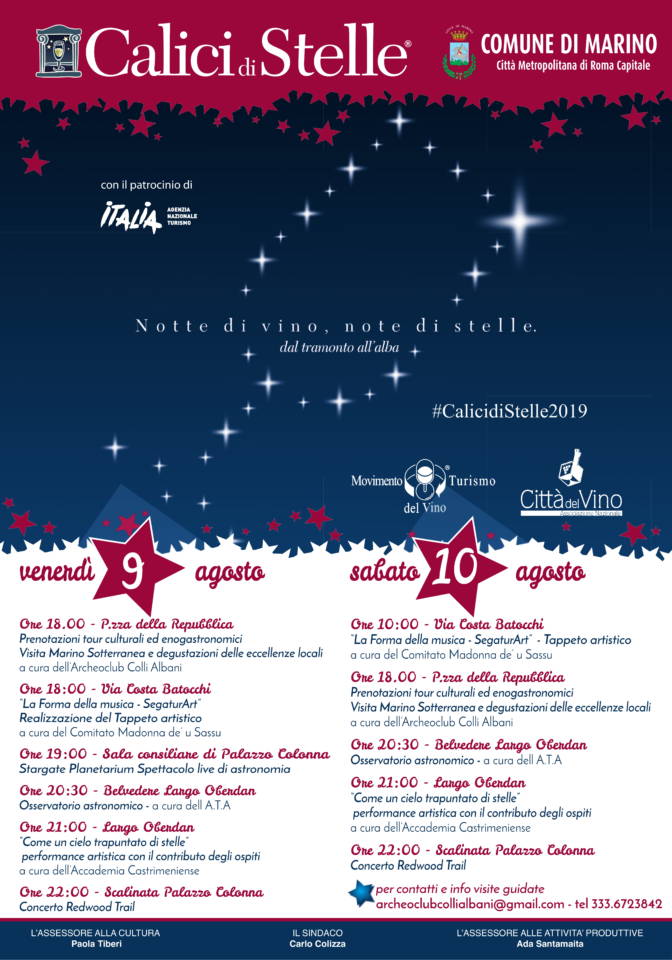 E’ con grande soddisfazione che l’Amministrazione comunale di Marino presenta la terza edizione di Calici di CALICI DI STELLE 2019, la manifestazione ideata dall’Associazione nazionale Città del Vino, di cui Marino fa parte, e dal Movimento Turismo del Vino. “Dopo il successo degli scorsi anni – ha dichiarato l’Assessore alle Attività Produttive Ada Santamaita, abbiamo voluto fortemente riproporre la terza edizione dell’evento, arricchendolo di nuovi contenuti. Fermo restando il filo conduttore della promozione del territorio marinese legato alle peculiarità vitivinicole, spiccano novità come lo STARGATE PLANETARIUM, planetario itinerante in Italia dotato della straordinaria tecnologia LASER 4K (Ultra HD) con le sue due cupole inserite nella sala consiliare di Palazzo colonna che presenteranno al pubblico un nuovo strumento immersivo astronomico relativo alla conoscenza del nostro pianeta stellare. Novità di rilievo è data dalla partecipazione straordinaria della quinta edizione di SEGATUR ART, quadri realizzati con la segatura dedicati al tema della musica che formano un suggestivo tappeto variopinto riprodotto su una via storica della città che ormai è divenuto un must della festa della Madonna de U Sassu, che per avversità climatiche è slittata nel contesto di Calici di Stelle come eccezione temporale. L’Accademia Castrimeniense curerà l’iniziativa ARTE SOTTO LE STELLE, una performance artistica dove gli artisti dipingeranno ein-plan-air una o più tele coinvolgendo gli ospiti. Importante novità sarà data dal settore enogastronomico che a differenza delle passate edizioni non si concentrerà in un unico sito ma sarà improntato in un percorso presso le attività commerciali che hanno aderito all’iniziativa e che metteranno a disposizione dei visitatori i loro prodotti per la degustazione itinerante, diventando così gli esercenti stessi i protagonisti della promozione del territorio. La cura del percorso enogastromico, delle visite guidate culturali nelle grotte, degli eventi musicali e dell’ambientazione scenografica sarà gestita dall’associazione ARCHEOCLUB COLLI ALBANI di Marino. In continuità con gli altri anni ci sarà la presenza dell’associazione ATA sulla terrazza di largo Oberdan, a cercare le stelle più brillanti fino a notte fonda con i telescopi. Vista l’importanza delle Associazioni partecipanti e la rilevante eterogeneità delle iniziative programmate,abbiamo previsto 4 passaggi di pubblicazione sul quotidiano La Repubblica, quindi al visitatore non rimane che immergersi nei diversi ambiti e scoprire tutte le bellezze e le bontà ideate per il terzo format di CALICI DI STELLE 2019 di Marino.