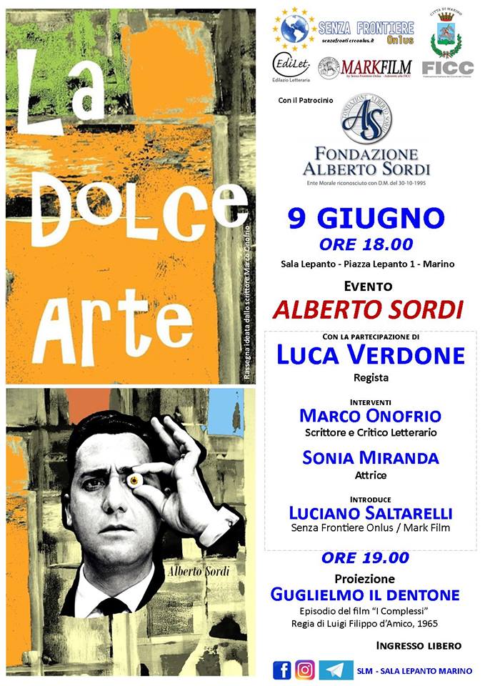 Sabato 9 giugno, alle ore 18, presso la Sala Lepanto di Marino (Piazza Lepanto, 1), quinto e ultimo appuntamento con “La Dolce Arte”, rassegna ideata dallo scrittore e critico letterario Marco Onofrio, dedicata ai “mostri sacri” del cinema italiano. Dopo il ricordo di Nino Manfredi, Alessandro Blasetti, Marcello Mastroianni e Cesare Zavattini, protagonista della prossima serata sarà Alberto Sordi. Durante l’iniziativa – promossa da Edilet-Edilazio Letteraria e organizzata da Markfilm, con il patrocinio del Comune di Marino e della Fondazione Alberto Sordi e il supporto della Federazione Italiana dei Circoli del Cinema, interverranno: il regista Luca Verdone, lo scrittore e critico letterario Marco Onofrio e l’attrice Sonia Miranda. Introdurrà l’evento il Presidente di Senza Frontiere Onlus Luciano Saltarelli. Dopo gli interventi, alle ore 19, sarà proiettato “Guglielmo il Dentone”, episodio del film “I Complessi” con regia di Luigi Filippo d’Amico, 1965.