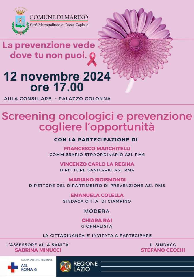 Martedì 12 novembre p.v., alle ore 17.00, presso l’Aula Consiliare di Palazzo Colonna, si terrà il convegno “Screening oncologici e prevenzione: cogliere l’opportunità”, organizzato dal Comune di Marino in collaborazione con il Sistema Sanitario Regionale della Asl Roma 6.