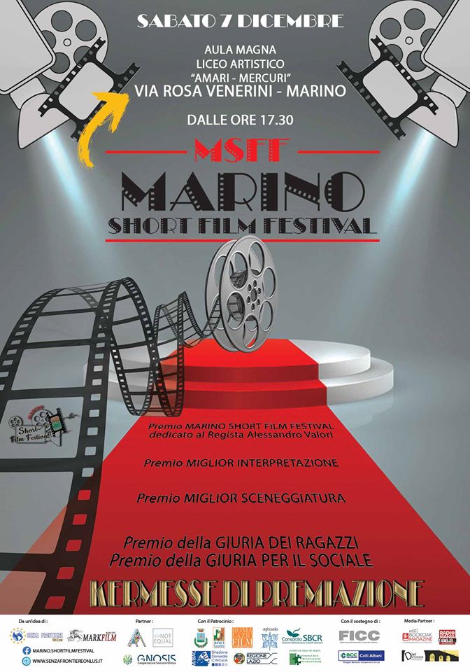 Siamo giunti alla conclusione della prima edizione del Marino Short Film Festival, manifestazione cinefila curata da Senza Frontiere Onlus e dal Circolo Mark Film con il patrocinio della Regione Lazio, del Comune di Marino, di ANCI Lazio, del Sistema Bibliotecario dei Castelli Romani, della Federazione Italiana dei Circoli del Cinema, di Lazio Film Commission e Agiscuola con il contributo della BCC Colli Albani. Un lungo cammino iniziato prima dell’estate, che si concluderà sabato 7 dicembre, alle ore 17.30, presso l’aula magna del liceo artistico “Amari – Mercuri” in via Rosa Venerini. La giuria consegnerà il premio “Marino Short Film Festival”, dedicato al regista Alessandro Valori. Saranno poi assegnati i premi alla “miglior interpretazione” e alla “miglior sceneggiatura”. Spazio anche al premio della “giuria dei ragazzi” e della “giuria per il sociale”. Tutte le opere vincitrici saranno proiettate durante la serata.