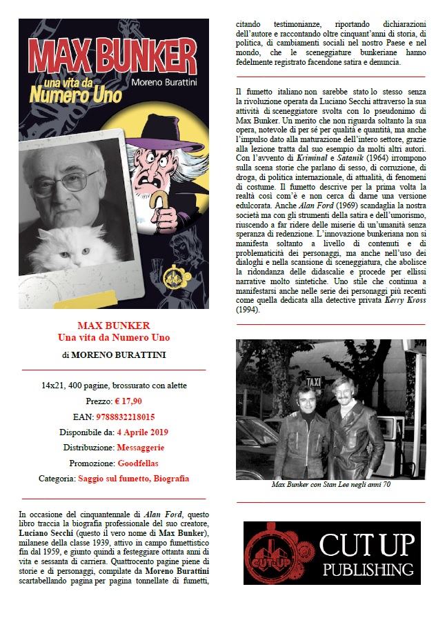 Edito da Cut Up Publishing, l’autore, già sceneggiatore di fumetti, scrittore, umorista e autore teatrale ripercorre con semplicità e maestria la storia del fumetto italiano, tracciando la biografia professionale del suo creatore Luciano Secchi, in arte “Max Bunker “, in occasione del cinquantennale di Alan Ford, del quale Bunker vanta la legittima paternità.