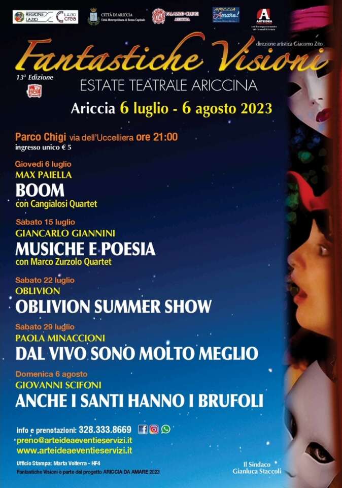 Torna ad Ariccia, con la XIII edizione, la programmazione di eventi culturali che compone la rassegna “Fantastiche Visioni” ideata e realizzata da Arteidea Eventi e Servizi – per la direzione artistica di Giacomo Zito – con il sostegno economico del Comune di Ariccia. La nuova stagione, dal 6 luglio al 6 agosto 2023, prevede in calendario cinque date nella meravigliosa cornice del Parco Chigi. Ad aprire il cartellone Max Paiella.