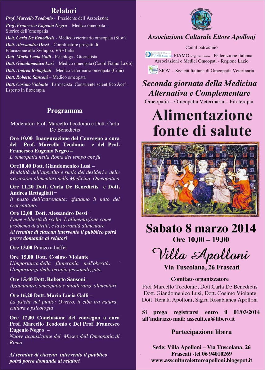 Sabato 8 marzo si terrà presso Villa Apollonj la Seconda giornata della medicina alternativa e complementare che quest’anno avrà come titolo “Alimentazione fonte di salute”. La prenotazione è gradita ma non obbligatoria e i lavori inizieranno alle 10 e termineranno alle ore 19; interverranno come relatori Marcello Teodonio – Presidente dell’Associazione con Francesco Eugenio Negro – Medico omeopata – Storico dell’omeopatia, Carla De Benedictis – Medico veterinario omeopata (Siov), Alessandro Dessì – Coordinatore progetti di Educazione allo Sviluppo, VSF Italia, Maria Lucia Galli – Psicologa e Giornalista, Giandomenico Lusi – Medico omeopata (Coord.Fiamo Lazio), Andrea Rettagliati – Medico veterinario omeopata (Cimi), Roberto Sansoni – Medico omeopata e Cosimo Violante – Farmacista- Consulente scientifico Acef – Esperto in fitoterapia. Il programma verrà inaugurato dalla prolusione dei professor Teodonio e Negro che tratterranno il tema de “L’omeopatia nella Roma del tempo che fu”. Il racconto della nascita del libro “Colera, omeopatia, ed altre storie: Roma 1837”(Palombi editore 1988) – in cui Marcello Teodonio ricostruisce, con una attenta analisi, la società romana dell’epoca. Le pagine del libro svelano piuttosto i comportamenti, la psicologia di massa, gli scenari organizzativi, le autodifese create per esorcizzare la paura che invase Roma e Francesco Negro vi pubblica stralci di un inedito prezioso manoscritto, focalizzando l’attenzione su una delle forme di lotta sperimentate per annientare la malattia: l’omeopatia. Si evidenzia dunque la volontà di sconfiggere il male con il principio puro “del curare il simile con il simile”. Le pagine più vive sono quelle in cui viene evocata la riscrittura che di questo colera ha effettuato il Belli. Quindi iI dottor Giandomenico Lusi esporrà la tematica della “Modalità dell’appetito e ruolo dei desideri e delle avversioni alimentari nella Medicina Omeopatica”. Nella Medicina Omeopatica le modalità dell’appetito, i desideri e le avversioni alimentari sono un importante elemento per la valutazione del paziente e per la scelta del rimedio. Il desiderio di cibi dolci o salati cibi freddi o caldi, non digerire determinati cibi o avversarne altri, il mangiare in fretta o lentamente, l’essere facilmente sazi o alla perenne ricerca del cibo, possono indicare all’omeopata attento la giusta terapia da prescrivere. Seguirà l’intervento dei dottori Carla De Benedictis e Andrea Rettagliati (Omeopati Veterinari)che intratterranno gli intervenuti con “Il pasto dell’astronauta”: sfatiamo il mito del croccantino spiegando che i croccantini ,l’alimento base dei nostri animali domestici è completamente innaturale, e toglie all’animale un elemento importantissimo che è l’appagamento nel cibarsi. L’alimentazione industriale induce molte malattie e non è compatibile con i trattamenti omeopatici. Se ne parlerà scherzando. Prima della pausa il dottor Alessandro Dessì farà una relazione sul tema fame e libertà di scelta. L’alimentazione come problema di diritti e di sovranità alimentare. Tutti gli interventi potranno essere inframezzati dalle domande del pubblico e si interromperanno per due ore in cui ci sarà spazio per il pranzo a buffet offerto dall’Associazione Ettore Apollonj. Dalle 15,00 i lavori riprenderanno con il dottor Cosimo Violante che interverrà sull’importanza della fitoterapia nell’obesità e della terapia personalizzata, trattando velocemente le principali piante in base al loro funzionamento per dimostrare l’importanza della figura del medico o del farmacista , evitando le mode del momento,  e il tanto in voga fai da te . Poi le ultime due relazioni: la prima del dottor Roberto Sansoni (omeopata pluralista) che parlerà di agopuntura, omeopatia e intolleranze alimentari, delle costituzioni in agopuntura energetica e costituzioni in omeopatia, proseguirà con la descrizione delle intolleranze alimentari e la distinzione in intolleranze costituzionali e intolleranze acquisite. Quindi la dottoressa Maria Lucia Galli, psicologa, spiegherà cos’è la psiche nel piatto. Ovvero, il cibo tra natura, cultura e psicologia. L’atto e i gesti del nutrirsi sembrano essere tra i più semplici e naturali. La psiche invece, collocandosi all’interno di una sorta di  “intelaiatura  sociale e culturale”, interagisce, per ogni singolo individuo, con una serie di modalità  composite che vanno dalle semplici preferenze alimentari, alle fobie,  fino alle patologie più serie inerenti il comportamento alimentare. Le conclusioni saranno affidate ai professori Marcello Teodonio e Francesco Eugenio Negro che sveleranno le nuove acquisizione del Museo dell’Omeopatia di Roma. L’appuntamento è nella consueta location di Villa Apolloni presso Via Tuscolana, 26 a Frascati.