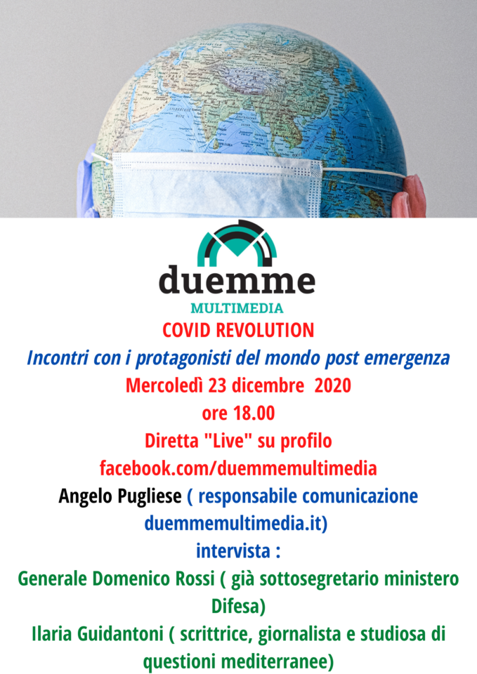Dopo i primi due appuntamenti di “COVID REVOLUTION” con gli esponenti del direttivo di ASSORETIPMI il 26 novembre e con gli ex quadri direttivi di “Italia Sicura” Mauro Grassi ed Erasmo D’Angelis l’11 dicembre la Società Cooperativa Duemme Multimedia organizza per mercoledì 23 dicembre alle ore 18.00 il suo terzo incontro in streaming dedicato a cercare di spiegare come sarà il mondo del dopo Coronavirus.