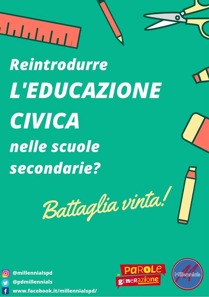 Dal prossimo anno scolastico l’Educazione Civica sarà inserita tra le materie curriculari e nei programmi scolastici nazionali e gli studenti avranno anche il voto in pagella su questa materia. La proposta è nata da una petizione online raccolta dai Millennials, movimento giovanile che raccoglie ragazzi e ragazze nati dopo il 2000 vicina al Partito Democratico, tanto che, nell’ultimo Congresso Nazionale il Segretario Matteo Renzi ha voluto inserire 20 Millennials all’interno dell’Assemblea Nazionale del partito.