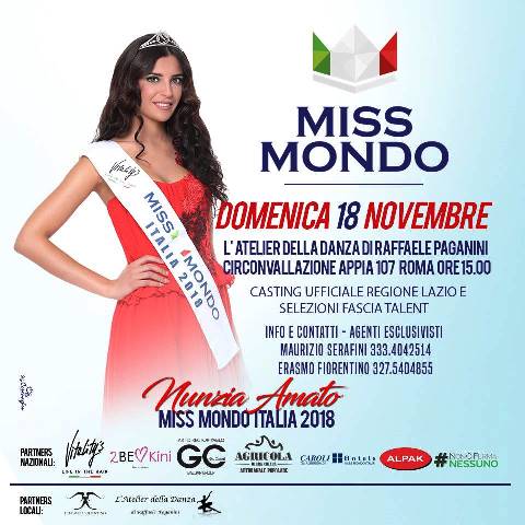 E’ ora il momento di pensare alla seconda tappa e, come già ufficializzato da settimane, domenica 18 novembre, presso l’Atelier della danza di Raffaele Paganini (Circonvallazione Appia 107 a Roma), si terrà il casting per la prossima selezione di Miss Mondo Lazio e per la fascia Talent.