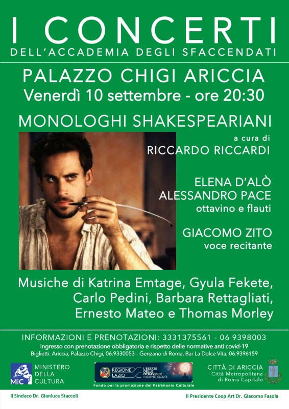 Venerdì 10 settembre, alle ore 20:30, “I Concerti dell’Accademia degli Sfaccendati” tornano nella Sala Maestra di Palazzo Chigi e ripropongono una loro produzione del 2019 il concerto/reading “Monologhi Shakespeariani” che allora riscosse un grandissimo successo di pubblico.