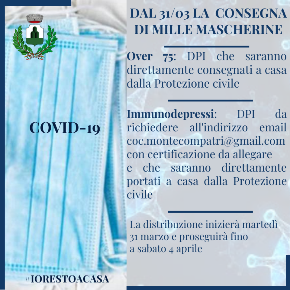 Ci scusiamo per il disagio e le modifiche, ma questa scelta è dettata da esigenze organizzative. Colgo l’occasione per fare chiarezza sul numero di mascherine: contattato il dipartimento regionale di Protezione civile, ci è stato confermato che sono stati consegnati mille dispositivi per errore nella compilazione degli elenchi, con comunicazioni mai pervenute al Comune Di Monte Compatri. Fatto che è accaduto anche in molte altre cittadine del territorio. Dovrebbero arrivare dalla Regione Lazio, nelle prossime ore, come comunicato telefonicamente, altre mille mascherine che distribuiremo sempre alle persone più esposte ai rischi di contagio da coronavirus. Voi, però, ricordate che è importante restare a casa”, lo scrive su facebook il sindaco Fabio D’Acuti