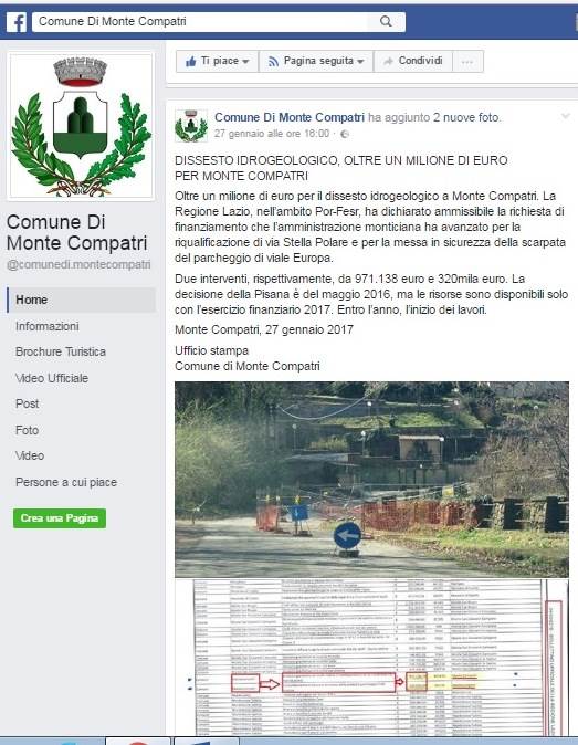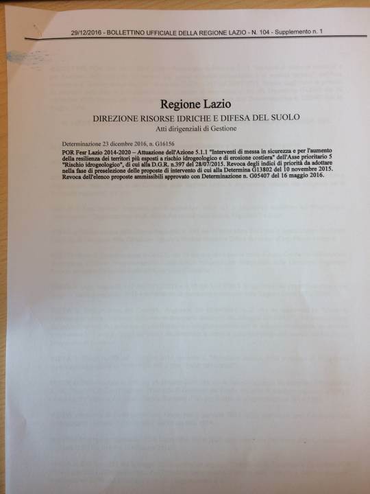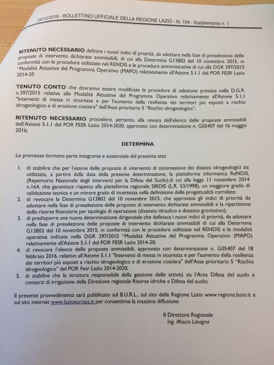 Peccato che i presunti finanziamenti, rispettivamente di €. 971.138,74 per dissesto idrogeologico su via Stella Polare (in corrispondenza di un cavalcavia in Loc. San Silvestro), e di €. 320.000,00 per il consolidamento e messa in sicurezza della scarpata del parcheggio Viale Europa, fossero stati revocati con la determina n.G16156 del 23/12/2016, che si allega per visione.