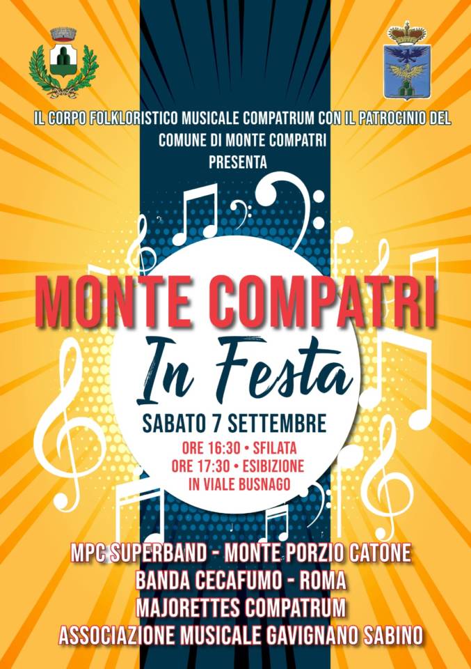 Monte Compatri in festa. Torna sabato 7 settembre 2019, nel paese dell’Angelo, il raduno bandistico organizzato dal @Corpo folkloristico musicale Compatrum ( “CORPO FOLKLORISTICO MUSICALE COMPATRUM” MONTECOMPATRI) e con il patrocinio dell’amministrazione comunale guidata da Fabio D’Acuti. L’evento, che era stato rinviato il mese scorso a causa del maltempo,vedrà la partecipazione della MPC Superband ’83 di Monte Porzio Catone, della Banda Cecafumo di Roma, delle Majorettes Compatrum e dell’ Associazione Musicale Gavignano Sabino. Appuntamento dalle 16:30 per la tradizionale sfilata e a seguire, dalle 17:30, l’esibizione in viale Busnago.