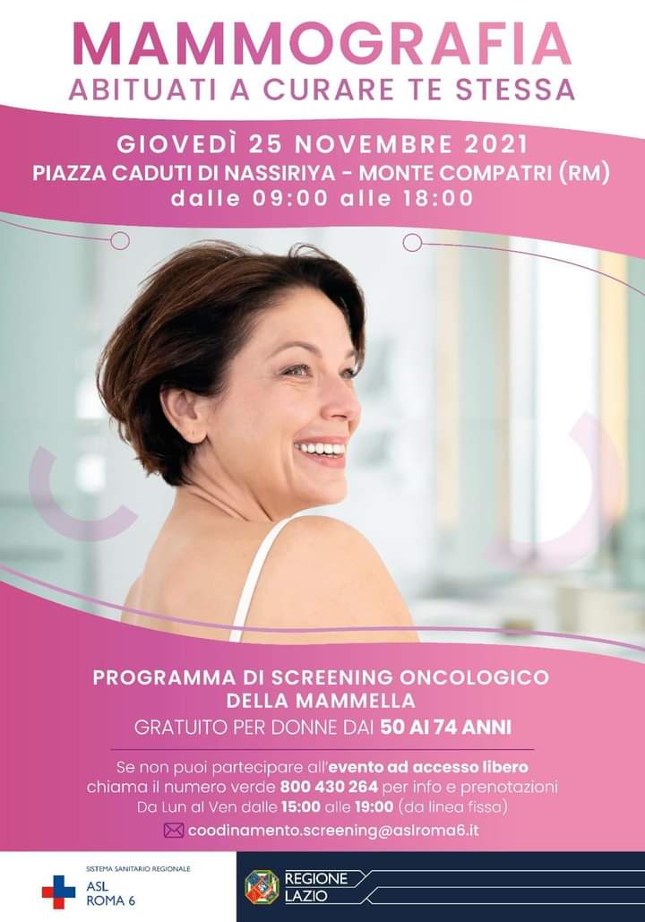Durante la Giornata internazionale per l’eliminazione della violenza contro le donne, a Monte Compatri sarà possibile eseguire uno screening mammografico gratuito. Un programma di screening oncologico organizzato dalla Asl Roma 6 e rivolto a donne dai 50 ai 74 anni. Appuntamento giovedì 25 novembre dalle ore 9 alle ore 18 in piazza Caduti di Nassiriya, dove arriveranno l’’unità mobile e gli operatori sanitari della Asl Roma 6.