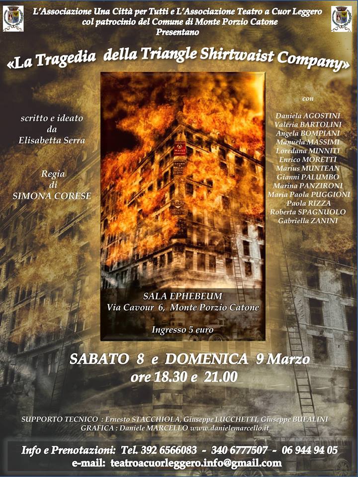 Lo spettacolo è stato scritto e ideato da Elisabetta Serra per la regia di Simona Corese, nasce dalla collaborazione tra l’Associazione Una Città per Tutti e l’Associazione Teatro a Cuor Leggero ed è stato patrocinato dal Comune di Monte Porzio Catone. Lo spettacolo è dedicato alle 146 vittime della Shirtwaist Company di New York, la maggioranza delle quali erano giovani donne uccise in un pomeriggio del 25 marzo 1911 da un incendio iniziato all’ottavo piano della Shirtwaist Company di New York. Mancavano venti minuti alle cinque del pomeriggio. Altri cinque e tutte le lavoratrici della camiceria si sarebbero alzate per tornare a casa, a Brooklyn. Gli impiegati degli altri uffici del palazzo se ne erano andati a mezzogiorno. Come fosse partita la prima fiammata non si sa ma in pochi istanti il fuoco attaccò i mucchi di stoffa dilagando per l’ottavo piano e avventandosi sul nono e sul decimo. Fu l’inferno. A tutte le centinaia di ragazze e bambine che lavoravano in quella fabbrica, sfruttate e malpagate, è dedicato questo spettacolo, «i dati allarmanti – spiega il sindaco Luciano Gori – emersi durante l’incontro sulla violenza di genere avuto qualche giorno fa a Monte Porzio Catone ci devono far riflettere, le violenze sulle donne continuano e vengono ancora perpetrate ai giorni nostri, non appartengono al passato e dobbiamo quindi restare vigili sulla problematica». Una denuncia ma anche un grande momento culturale, «con questa forma di teatro impegnato – spiega l’assessore alla cultura, il vicesindaco Massimo Pulcini – l’arte si unisce alle tematiche sociali trasformando il tempo libero in sano momento di riflessione. Così il Teatro afferma quella funzione educativa che gli è propria fin dai tempi della Tragedia Greca».