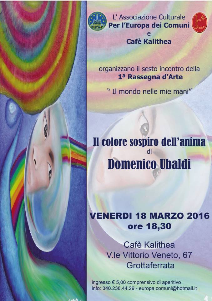 Nel colore il sospiro dell’anima, la mostra personale dell’artista Domenico Ubaldi, si svolgerà venerdì 18 marzo alle 18.30 presso il Cafè Kalithea in Viale Vittorio Veneto, 67 a Grottaferrata (RM). Inserita nell’ambito della 1a Edizione della Rassegna d’Arte “Il mondo nelle mie mani”, l’esposizione pittorica è promossa dall’ Associazione culturale marinese Per l’Europa dei Comuni in collaborazione con il Cafè Kalithea.