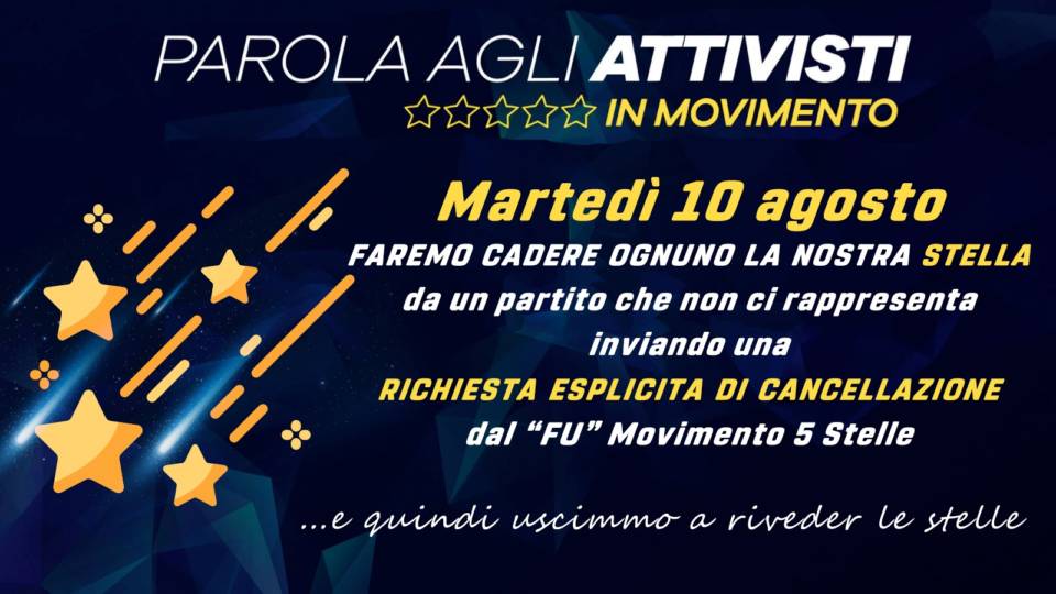 Forti dei nostri ideali fondanti, che rispecchiano i più alti valori di democrazia diretta e partecipata, faremo sparire in modo virtuale ognuno la propria stella, cancellandoci tristemente da un partito di cui ormai disapproviamo le azioni e suggellando così la nostra uscita dal Movimento, nella serata delle stelle cadenti”. Lo rendono noto gli organizzatori