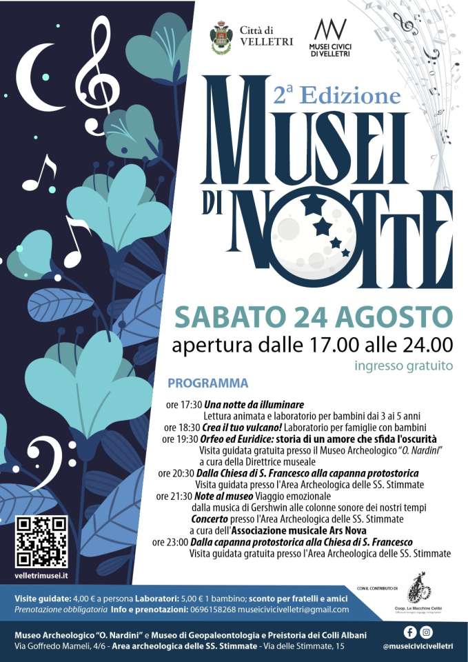 I Musei Civici di Velletri ospiteranno la 2° edizione dei “Musei di Notte”. Sabato 24 agosto dalle ore 17.00 alle ore 24.00 torna la manifestazione che unisce le visite guidate alla musica, in una festa serale per cittadini e turisti.