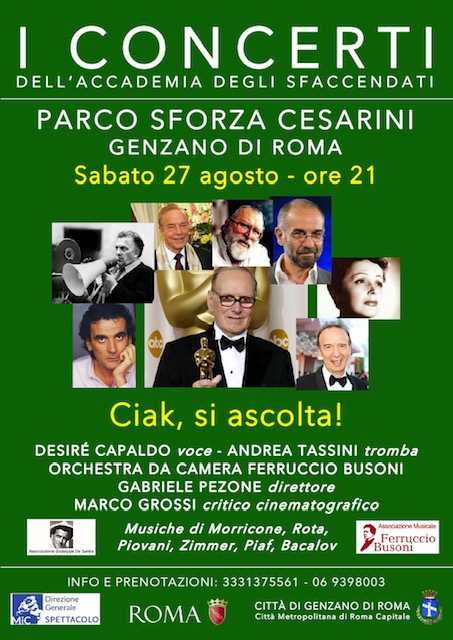 Straordinario esempio di “parco romantico”, Parco Sforza Cesarini ospiterà la cantante Desiré Capaldo, la tromba solista di Andrea Tassini e l’Orchestra da Camera Ferruccio Busoni diretta da Gabriele Pezone che proporranno un programma di musiche da film intitolato “Ciak, si ascolta!”.