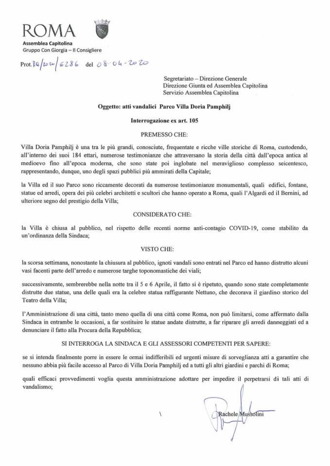 Per questo motivo, nei giorni scorsi, è stata protocollata un’interrogazione indirizzata al Sindaco e all’assessore competente nella quale si chiede la definizione di misure di sorveglianza atte a garantire una delle ville storiche più grandi della nostra città, Villa Pamphilj. Questo spazio, nonostante fosse chiuso al pubblico come altre aree verdi in ottemperanza alle recenti disposizioni anti Covid_19, è stato oggetto a più riprese di innumerevoli atti vandalici. La scorsa settimana sono stati distrutti vasi e targhe toponomastiche presenti al suo interno, mentre nei giorni scorsi a essere presa di mira è stata la fontana del Nettuno.