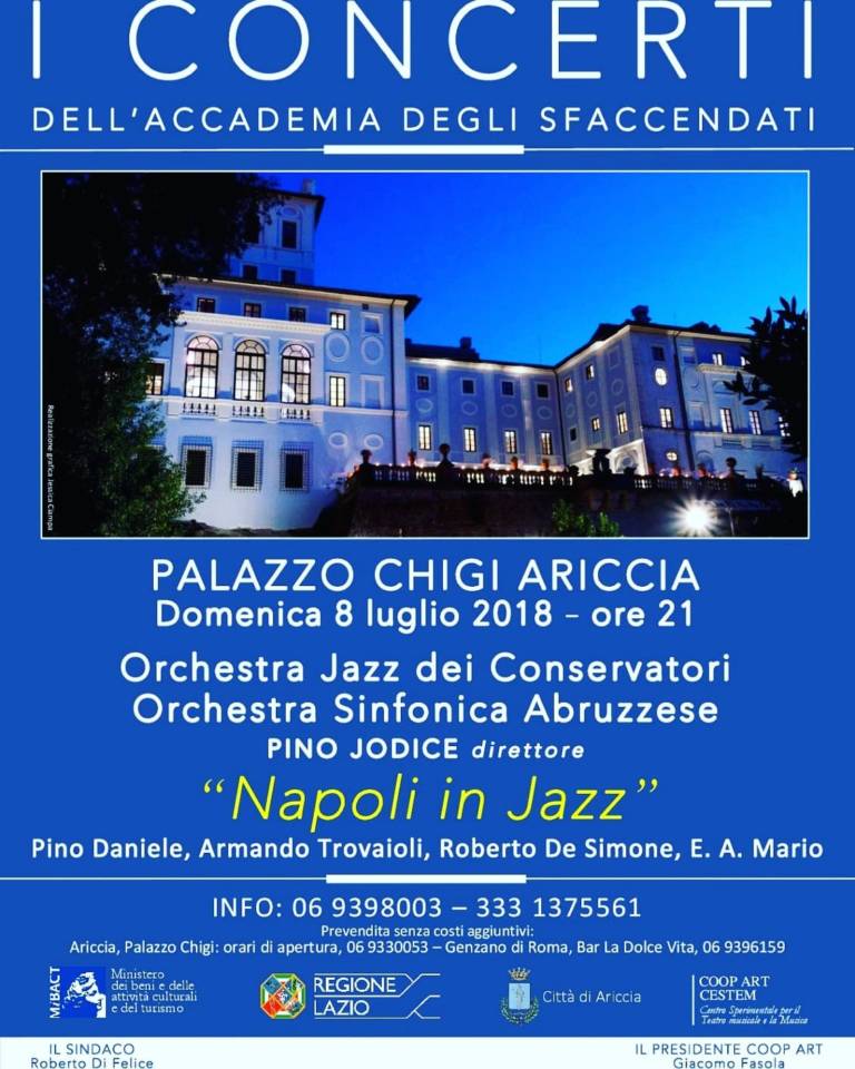 Dopo il grande successo a Villa Falconieri a Frascati sabato 30 giugno, I Concerti dell’Accademia degli Sfaccendati tornano nella loro sede istituzionale per il concerto di domenica 8 luglio alle ore 21. Nella corte interna di Palazzo Chigi ad Ariccia si riuniscono due grandi orchestre: l’Orchestra Sinfonica Abruzzese e l’Orchestra Nazionale Jazz dei Conservatori Italiani per un totale di più di 60 elementi. Per metterle insieme il direttore Pino Jodice ha ideato un progetto, costituito dalla rielaborazione jazzistica di alcune tra le più indimenticabili melodie della tradizione classica partenopea , che lo vede impegnato anche come arrangiatore e compositore oltre che come direttore d’orchestra.