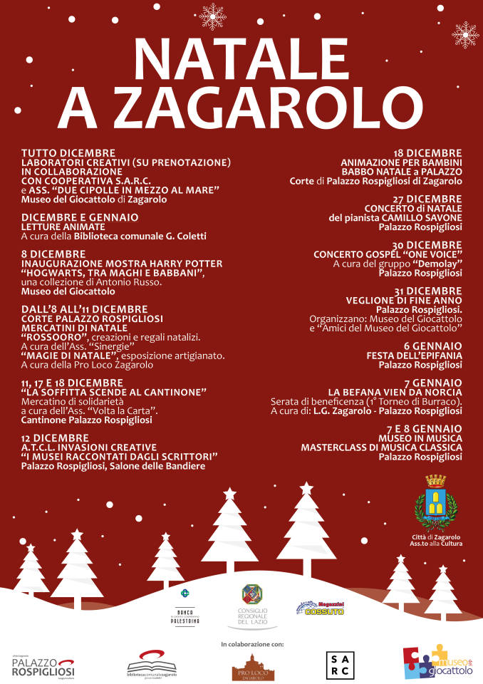 Il weekend dell’8 Dicembre coincide con l’apertura del ricco cartellone di eventi previsti a Zagarolo per il periodo natalizio. Giovedì 8 Dicembre si apriranno i mercatini di Natale “RossoOro” e “Magie di Natale”, a cura dell’Associazione “Sinergie” e della Pro Loco di Zagarolo. Lungo la corte di Palazzo Rospigliosi si alterneranno stand di creazioni, regali natalizi ed artigianato. Nello stesso giorno avverrà l’inaugurazione della mostra dedicata ad Harry Potter dal titolo “Hogwarts, tra Maghi e Babbani”. “Come ogni anno Zagarolo ha organizzato numerosi eventi per il periodo natalizio – spiega il Sindaco di Zagarolo, Lorenzo Piazzai. – La collaborazione con le associazioni locali, la Pro Loco, l’Istituzione Palazzo Rospigliosi e il Museo del Giocattolo, ha prodotto un cartellone di iniziative aperte a tutti, dedicate soprattutto ai più piccoli, veri protagonisti dell’atmosfera natalizia”. Per tutto il mese di Dicembre, fino al giorno dell’Epifania, il Museo del Giocattolo, in collaborazione con la Cooperativa S.A.R.C. e l’Associazione “Due cipolle in mezzo al mare”, presentano laboratori creativi per bambini (è necessaria la prenotazione). Sempre nello stesso periodo, la Biblioteca comunale G. Coletti di Zagarolo organizza letture animate per i più piccoli. Lunedì 12 Dicembre l’“Associazione Teatrale fra i Comuni del Lazio” organizza “Invasioni creative”, una manifestazione intercomunale che nella Sala delle Bandiere di Palazzo Rospigliosi presenta “I Musei raccontati dagli scrittori”, una raccolta di sei racconti inediti scritti da autori emergenti del territorio. L’11, il 17 e il 18 Dicembre, nel Cantinone di Palazzo Rospigliosi, appuntamento con “La soffitta scende al Cantinone”, i mercatini di solidarietà organizzati dall’Associazione “Volta la Carta”. Per la seconda parte di Dicembre non mancheranno animazione per bambini, concerti di Natale (con il pianista Camillo Savone) e cori Gospel (con il coro One Voice, a cura del gruppo Demolay). Il 31 Dicembre Veglione di fine anno a Palazzo Rospigliosi con il Museo del Giocattolo e gli “Amici del Museo del Giocattolo”. Il 6 e 7 Gennaio appuntamento a Palazzo Rospigliosi per due eventi legati all’Epifania: magia e animazione per i più piccoli; serata di beneficenza (1° Torneo di burraco) con ricavato devoluto alle popolazioni colpite dal sisma. “Questo Natale sarà all’insegna della creatività – aggiunge l’Assessore alla Cultura del Comune di Zagarolo, Emanuela Panzironi. – Il weekend che si apre sarà ricco di inaugurazioni con i mercatini di Natale, la mostra dedicata ad Harry Potter e i tanti laboratori che vedranno impegnati i bambini: Palazzo Rospigliosi e il Museo del Giocattolo saranno il vero fulcro delle manifestazioni natalizie. In questi giorni partiranno anche corsi per bambini nelle scuole: tutti saranno coinvolti nell’approfondimento del gioco del Quidditch in vista del torneo del 17 e 18 Dicembre”.