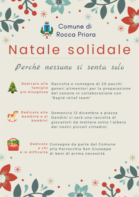 Affinché nessuno resti indietro o si senta solo nei giorni delle festività, il Comune di Rocca Priora in collaborazione con “Rapid relief team” consegnerà alle famiglie più bisognose pacchi di generi alimentari per la preparazione del cenone della vigilia di Natale.