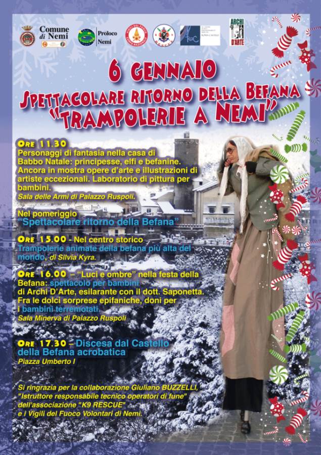 Si chiuderà questa giornata alle 17.30 con la spettacolare discesa acrobatica dal Castello di Nemi dell’attesissima della Befana. Si ringrazia per la collaborazione Giuliano Buzzelli, istruttore responsabile e tecnico operatori di fune dell’associazione “K9 Eescue” e i Vigili del Fuoco volontari di Nemi.
