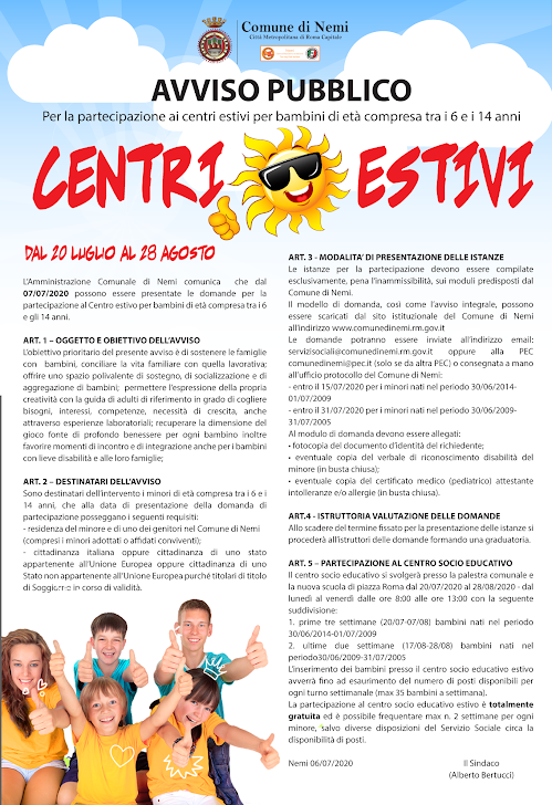 L’amministrazione Comunale di Nemi comunica che dal 07 Luglio 2020 possono essere presentate le domande per la partecipazione al Centro estivo per bambini di età compresa tra i 6 e gli 14 anni. L’Amministrazione Comunale ha voluto fortemente avviare questa iniziativa dei Centri Estivi con L’obiettivo prioritario di sostenere le famiglie con bambini, conciliare la vita familiare con quella lavorativa; offrire uno spazio polivalente di sostegno, di socializzazione e di aggregazione di bambini; permettere l’espressione della propria creatività con la guida di adulti di riferimento in grado di cogliere bisogni, interessi, competenze, necessità di crescita, anche attraverso esperienze laboratoriali; recuperare la dimensione del gioco fonte di profondo benessere per ogni bambino inoltre favorire momenti di incontro e di integrazione anche per i bambini con lieve disabilità e alle loro famiglie.