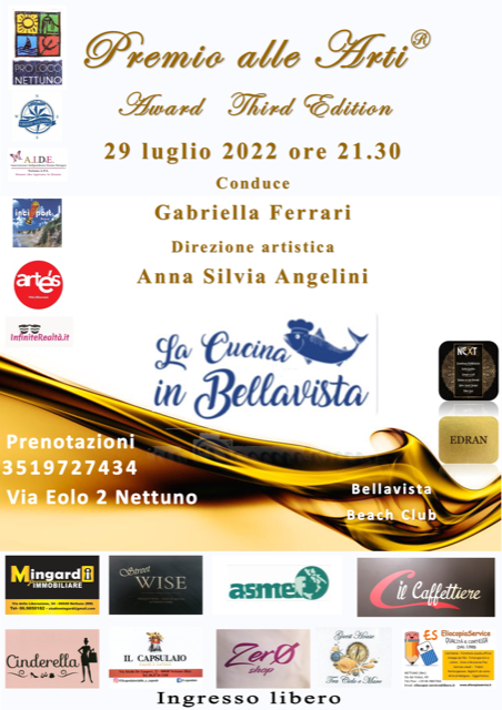 Con il patrocinio della Pro Loco di Nettuno al via la III Edizione del “Premio alle Arti”, ideato e organizzato da Anna Silvia Angelini che ne cura anche la direzione artistica, l’evento Premia Eccellenze Nazionali e Internazionali nelle categorie (arti,, cinema, musica, giornalismo e letteratura).