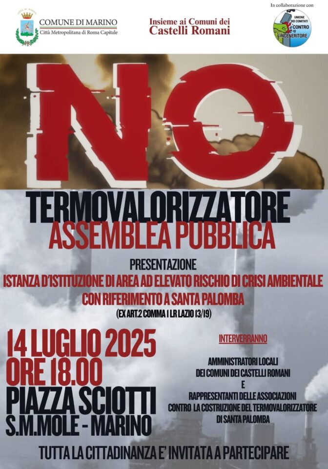 Il Comune di Marino, insieme ai Comuni dei Castelli Romani e in collaborazione con l’Unione dei Comitati contro l’Inceneritore, promuove un’importante Assemblea Pubblica contro la realizzazione del termovalorizzatore di Santa Palomba.