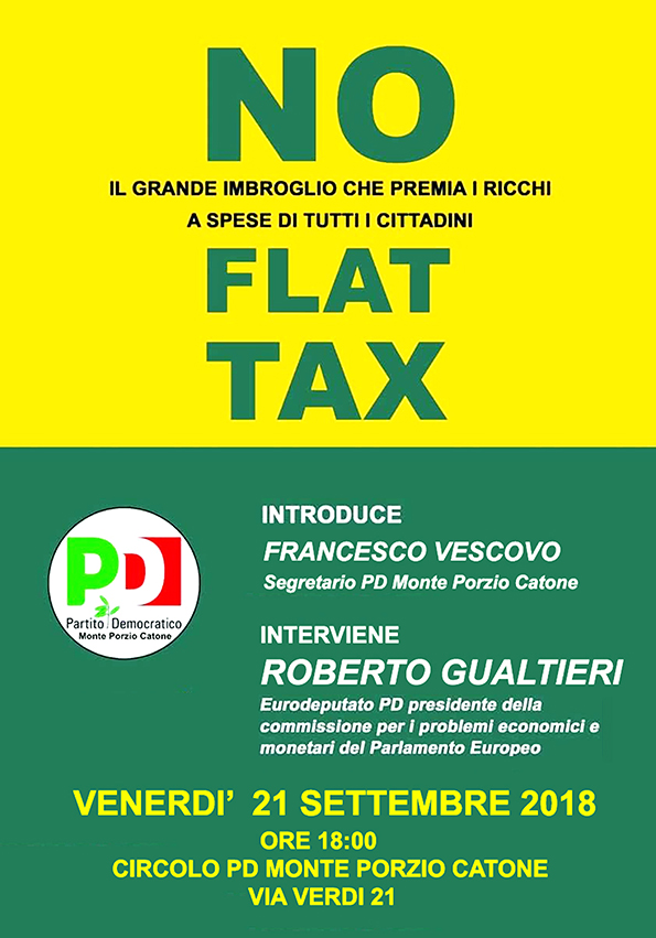 “NO FLAT TAX! Per saperne di più e confrontarci sul grande imbroglio che premia i ricchi a spese di tutti i cittadini, il Circolo PD “A.Gramsci” di Monte Porzio Catone ha indetto un incontro con l’EURODEPUTATO PD ROBERTO GUALTIERI, per VENERDÌ 21 SETTEMBRE alle ore 18:00 nella sede in Via Verdi 21. Introdurrà il Segretario della Sezione FRANCESCO VESCOVO. L’incontro è aperto a tutti”. Dichiara il Comitato Direttivo del Circolo PD di Monte Porzio Catone.