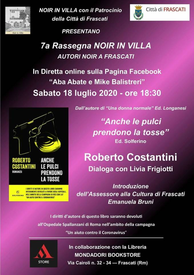 In diretta sulla pagina Facebook “Aba Abate e Mike Balistreri” sabato 18 luglio dalle ore 18:30 andrà in onda la presentazione di questo nuovo lavoro. Saranno i lettori e Noir in Villa, dunque ad essere ospiti di Roberto Costantini, già autore di Una donna normale edito da Longanesi, che presenta “Anche le pulci prendono la tosse”, il suo nuovo romanzo edito da Solferino. Dialogherà con lui la scrittrice e ideatrice di Noir in Villa Livia Frigiotti, con la partecipazione di Emanuela Bruni, Assessore alla Cultura del Comune di Frascati.