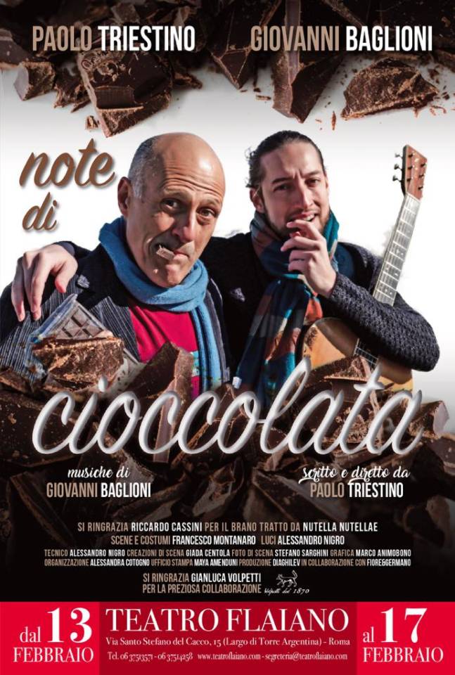 Paolo Triestino e Giovanni Baglioni saranno i protagonisti al Teatro Flaiano – dal 13 al 17 febbraio – di Note Di Cioccolata, scritto e diretto da Paolo Triestino, musiche di Giovanni Baglioni.