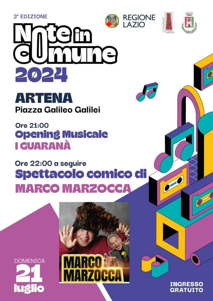 Domenica 21 luglio presso piazza Galileo Galilei alle ore 21:00 si terrà prima lo spettacolo musicale con “I Guaranà”; alle 22:00 si terrà lo show comico del famoso attore Marco Marzocca. Questi due eventi rientrano nel terzo appuntamento del cartellone della manifestazione “Note in Comune”, giunta alla terza edizione, fortemente voluta dal presidente del Consorzio, l’On. Angelo Rossi.