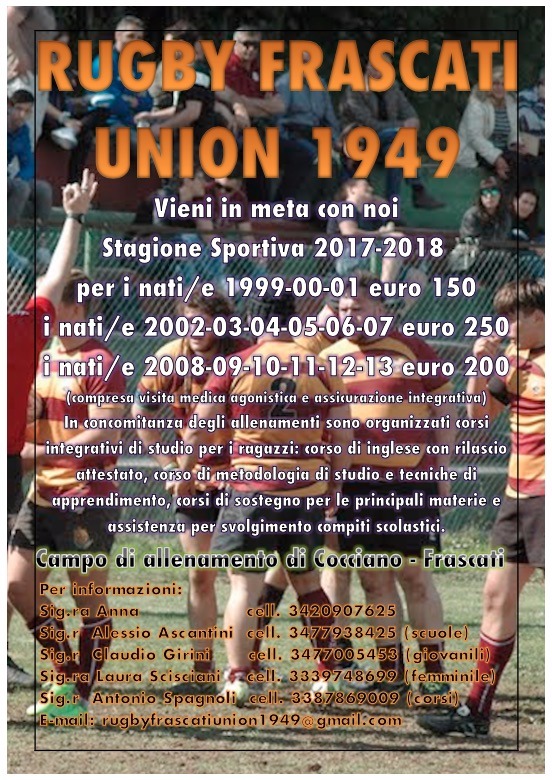 Il Rugby Frascati Union 1949 è in continua crescita. E vuole progredire anche per ciò che riguarda l’attività giovanile, anche quest’anno affidata alla responsabilità di Claudio Girini (per il campo) e Alessio Ascantini (per i progetti con le scuole). «La stagione appena messa alle spalle ha rappresentato il nostro anno zero – dice Girini – Abbiamo avuto già ottimi riscontri pur partendo con l’attività solamente da novembre a causa di precedenti problemi di spazi che per la nuova stagione, anche grazie al lavoro del Comune di Frascati, non dovrebbero registrarsi. Tutte le società sportive cittadine hanno avuto la possibilità di pianificare e questo rende il lavoro decisamente più snello. Anche per questo cercheremo di crescere ancora rispetto alla scorsa annata quando riuscimmo a creare dei gruppi in età Under 6, Under 8, Under 10 e Under 12 e quando coinvolgemmo un numero complessivo di circa 800 bambini durante le manifestazioni organizzate con le scuole con cui abbiamo collaborato, ma l’obiettivo a breve termine è quello di riuscire a “coprire” tutte le categorie, comprese anche Under 14 e 16 : non ne facciamo, però, solo un mero discorso numerico, ma cercheremo di lavorare sulla qualità». Per farlo il Rugby Frascati Union 1949 ha ufficializzato le tariffe per l’iscrizione divise per fasce d’età (consultabili tramite sito e pagina Facebook ufficiale oppure contattando i numeri di telefono dei vari responsabili) e ha messo in programma alcune interessanti iniziative: tra queste ce n’è una che unisce la passione per il rugby alle attività formative e scolastiche. «Abbiamo pensato di mettere a disposizione dei nostri tesserati dei corsi integrativi di lingue, in primis inglese ma eventualmente anche spagnolo e francese – specifica Girini – Li vorremmo proporre prima o dopo gli allenamenti, ipotizzando anche un piccolo esame con la consegna di un attestato a fine anno. Assieme a questi vorremmo organizzare anche dei corsi di metodologie di studio e tecniche di apprendimento, corsi di sostegno per le principali materie e assistenza per lo svolgimento dei compiti scolastici».